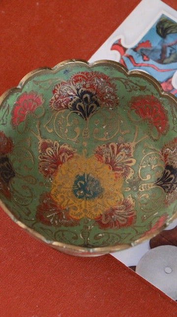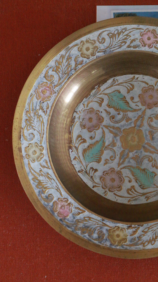 Vintage Brass Enamel Scalloped Bowl with Floral Motif