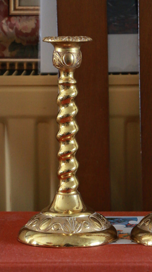 Pair of Vintage Brass Barley Twist Candlesticks – Ornate Embossed Base