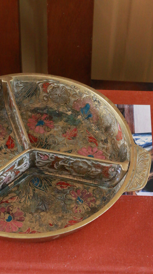 Hand Painted Brass Divided Dish Floral Design