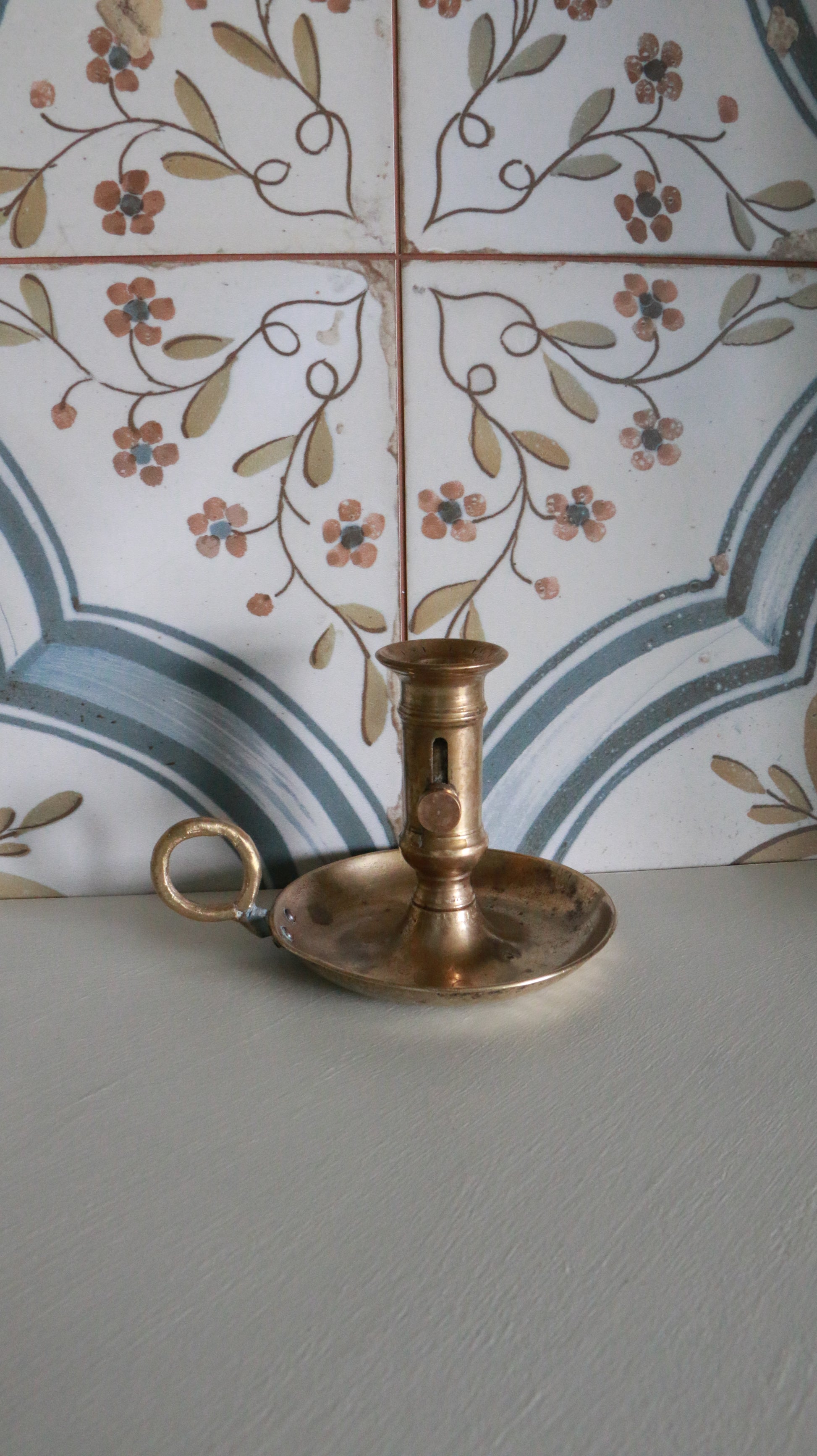 Solid brass chamberstick candle holder with a functional sliding mechanism to adjust the candle height. This piece features a round tray base and side finger loop, typical of 19th to early 20th-century design. Signs of age and patina give it a warm, lived-in character—great for styling on a mantel, bedside, or bookshelf.