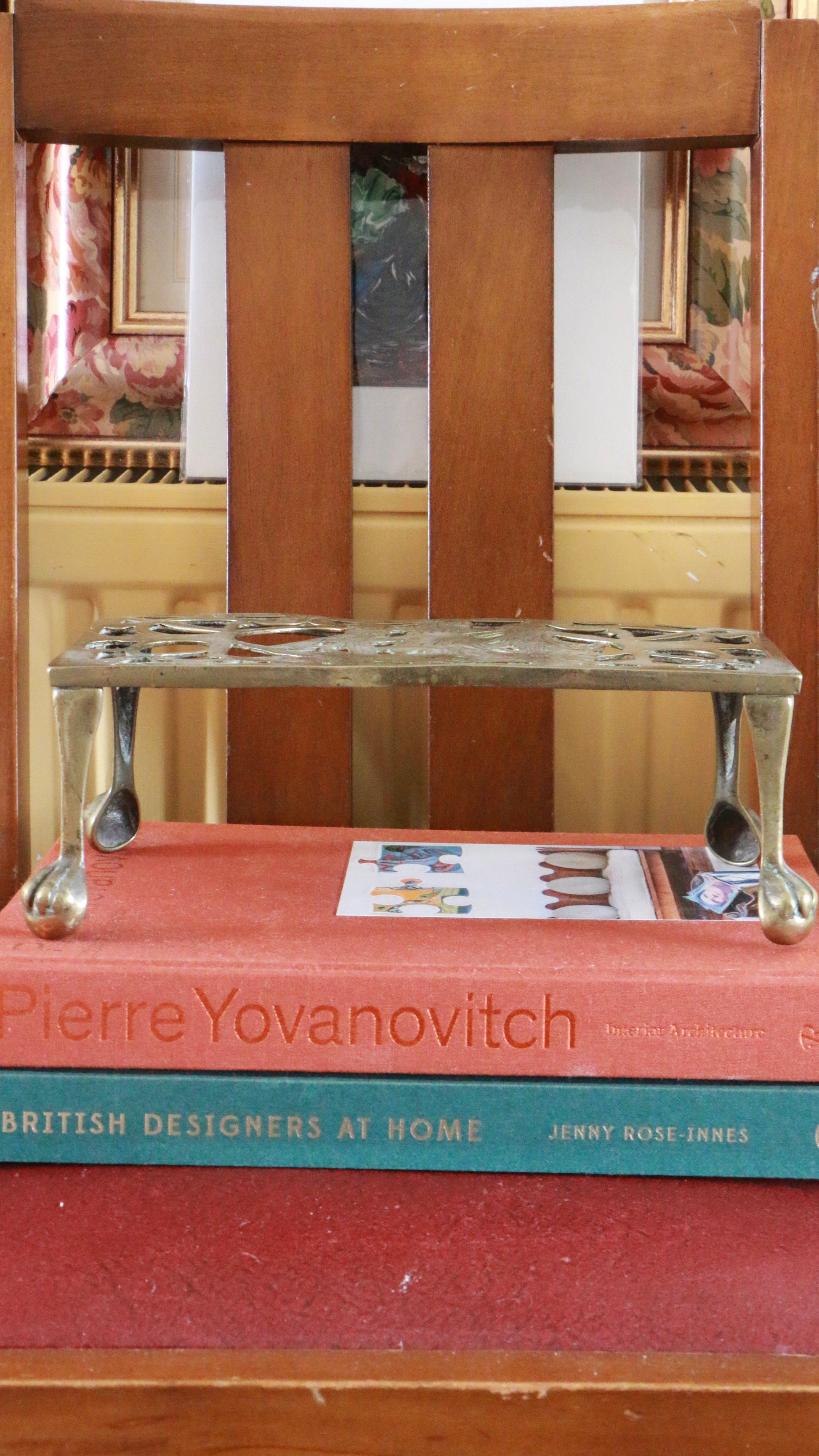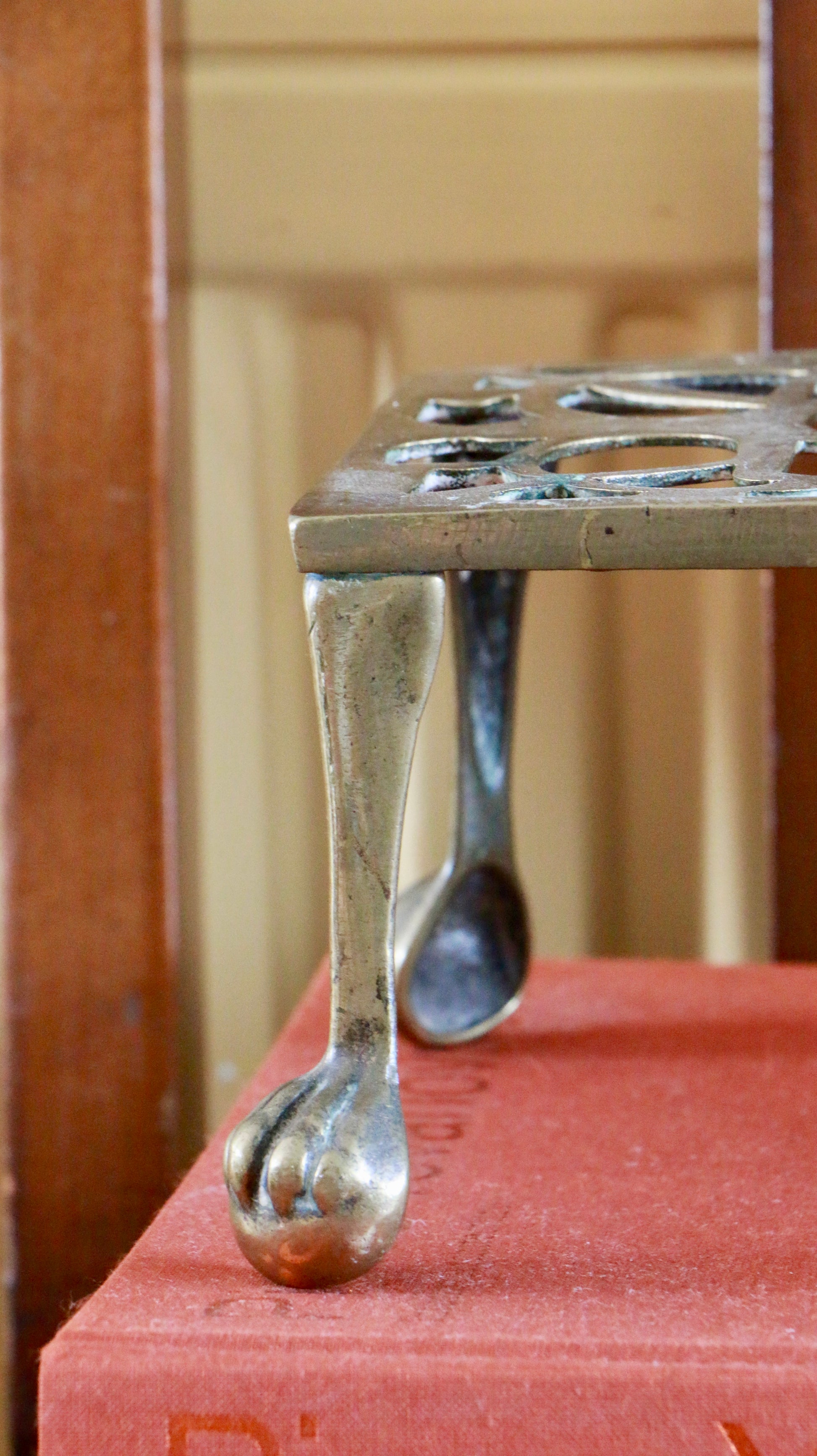 This vintage brass trivet features a striking cut-out sailing ship motif framed by scrollwork and raised on paw feet. Both functional and decorative, it can be used as a heat stand for teapots or pans, or styled as a nautical accent in the kitchen or living room. The patina shows its age, adding authentic charm.