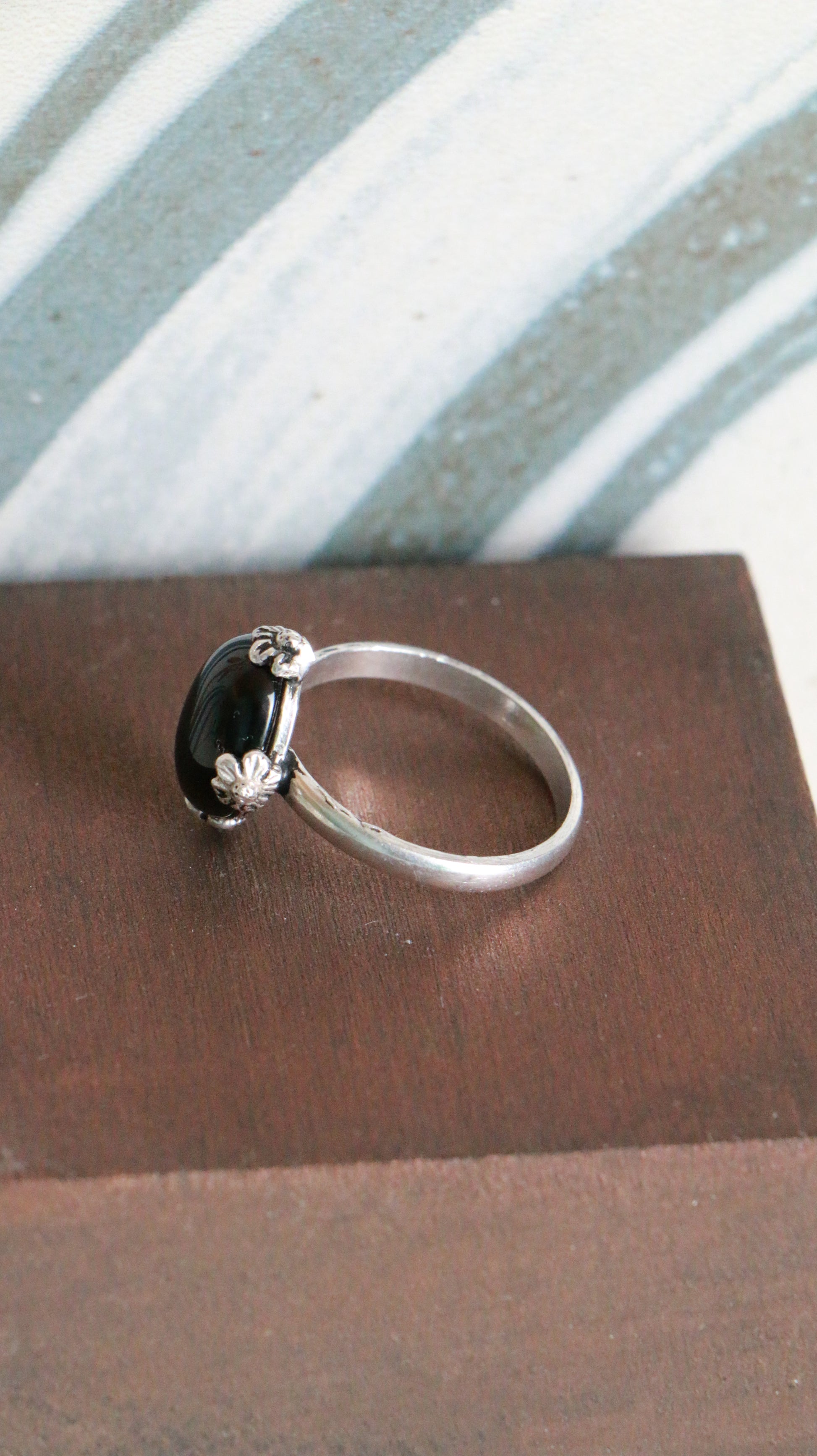This vintage sterling silver ring features a smooth black cabochon stone held by four delicate prongs with floral-like detailing. The deep black stone is domed and polished to a reflective finish, giving it an elegant and dramatic presence. Its minimalist band contrasts beautifully with the ornate setting, making it a striking piece for daily wear or special occasions. The silver has a soft patina consistent with age, and the ring is solid yet comfortable on the finger.